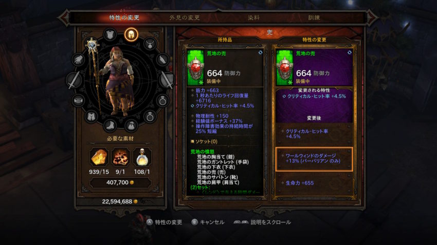 単純に、ワールウィンドのダメージアップを付与できるものに関しては、徹底してそれを付けていく。……もちろん、1発で欲しい能力を付けられるわけもなく、物欲センサー発動しまくりで50回くらいやり直しをさせられたけど(泣)。俺の素材返せや(オヤジの憤怒)。