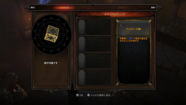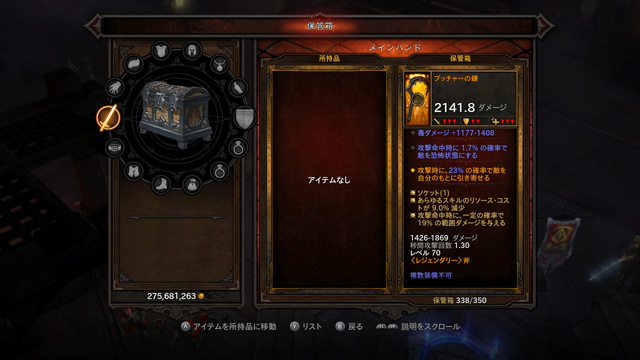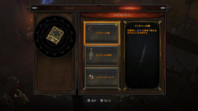 特殊能力がついている手持ちのレジェンダリー・アイテムがズラリと表示される。特殊能力ってのは、たとえば“ブッチャーの鎌”だと、