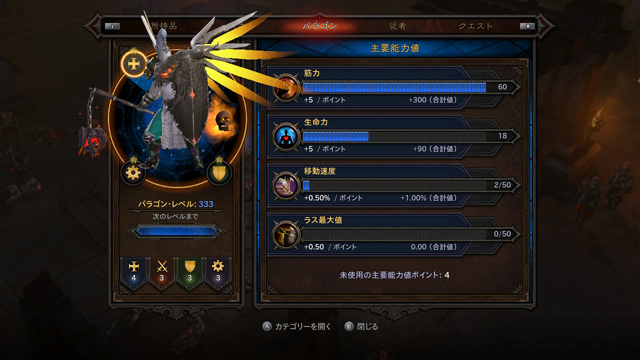 パラゴンてのは要するに、“プレイヤーが自由に割り振れるポイント”のこと。パラゴンには4つのカテゴリーがあり、それぞれ、移動速度や生命力を上げられる“主要能力値”、攻撃速度やクリティカルヒット率などを上げられる“攻撃”、防御力や耐性を上げられる“防御”、範囲ダメージやゴールド発見量なんかを上げられる“ユーティリティー”に分かれている。