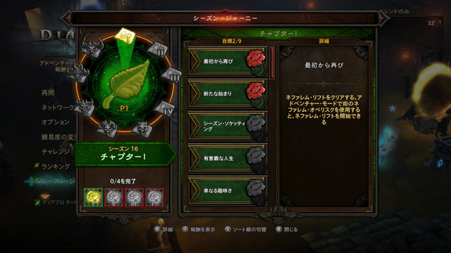 シーズンは簡単に書くと、“一定の期間でデータが刷新され、すべてのプレイヤーがイチからスタートするモード”である。現在は“シーズン16”が進行中で、これは数ヵ月の運用ののちに新シーズンに切り替わるものだ。つまりこれまでの数年間でシーズン1~15までが行われていた、ってわけ。“イチから”ってのは文字通りで、アイテムもお金もパラゴンもすべて持たず、まっさらなレベル1のキャラで始める……ということ。こう書くと、