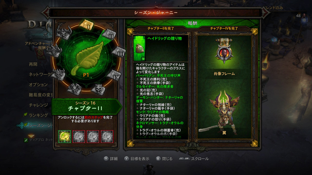 シーズンではさまざまな“目標”が、4つのチャプターに分かれて設定されている。たとえば、“ベリアルを倒せ”とか“従者のひとりを完全武装させろ”とかとか……。これらをチャプターごとにクリアーしていくと、セット装備やらシーズンでしか手に入らない報酬がもらえたりするのだ。