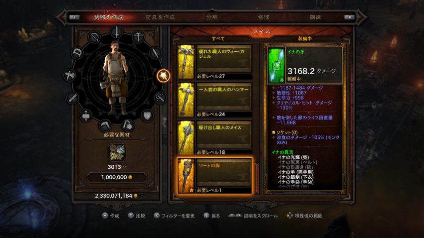 武具屋の作成リストにワートの脚(レジェンダリー・メイス)がラインアップ!! 迷わず作成してもらうと!