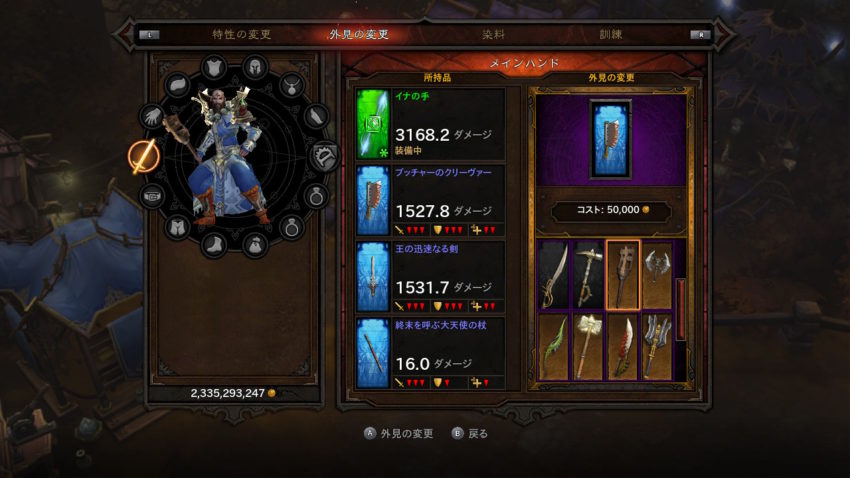 前述のブッチャーのクリーヴァーなど、トリストラムの闇で手に入る武器によって、外見変更が可能になるものがある。それが、