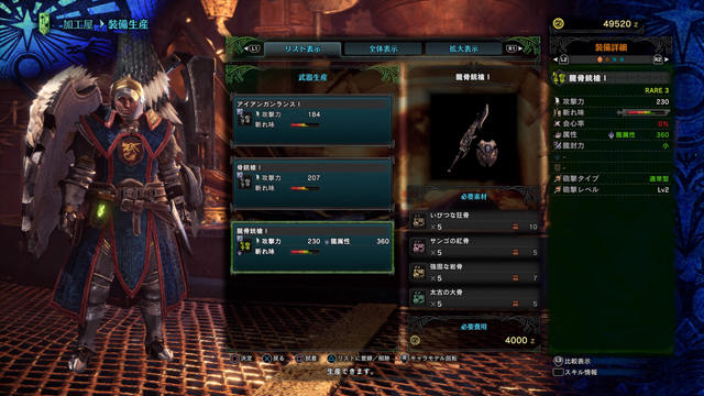 あらゆるフィールドに落ちている骨から作れるという、ダッシュ島の浜辺のようなガンランス(どんなだ)、“龍骨銃槍 I”である。ご覧の通り、龍属性をまとった逸品。簡単に作れるわりに性能が優秀で、序盤はコレ1本あればどうにかなるというじつにコストパフォーマンスが高いガンランスなのである。