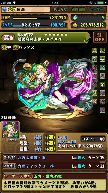 が、唯一の不安材料が、追加攻撃担当、光属性枠として連れてきたシルヴィであった。彼女はまことに強くて使い勝手がいいんだけど、残念ながらバインド耐性がついていない。これにより、バインド攻撃には積極的に掛かってしまうわけだが、ここで困るのが“光属性はシルヴィしかいない”ってこと……。シルヴィが潰れると、木光闇の3色消しで発動するリーダースキルが不発となり、さすがの闇メイメイちゃんも木偶と化してしまうのだ。