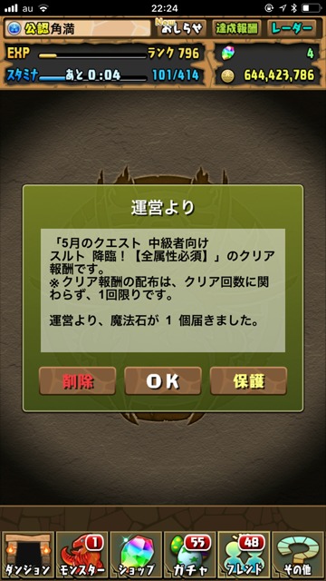というわけで、5月のクエストを中心に未クリアーダンジョンを周回。