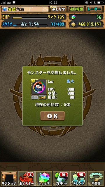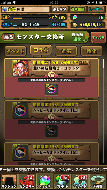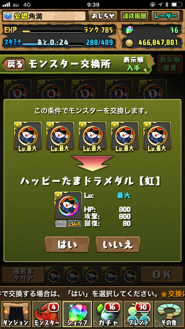 でもこのメダル、モンスターボックス内ではスタックされないので、溜まるに任せていると速攻でボックスがパンパンになってしまう。なので、適度に交換していくのが得策。そこで俺は、ハッピーたまドラメダル【銅】が3個溜まったら【銀】に、【銀】が3個になったら【金】に、【金】が5個になったら最高ランクの【虹】に……という、わらしべ長者的な交換を続けていたのである。ここ2日間、ずっと……。