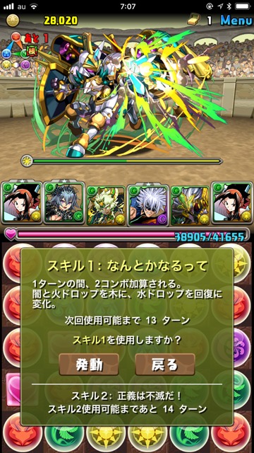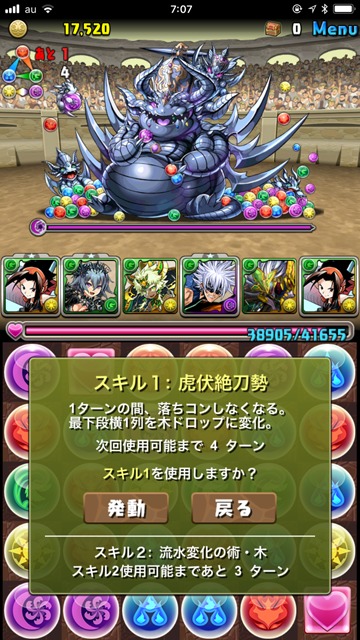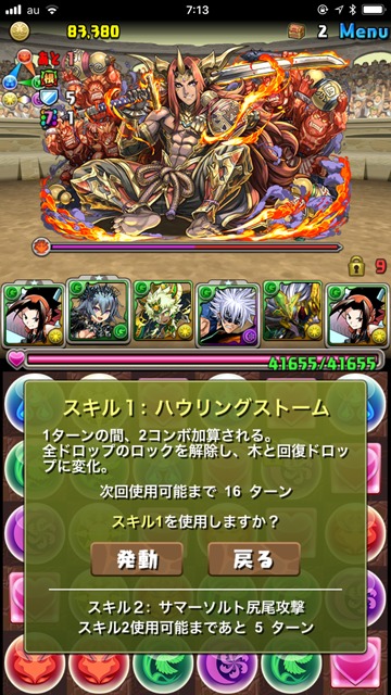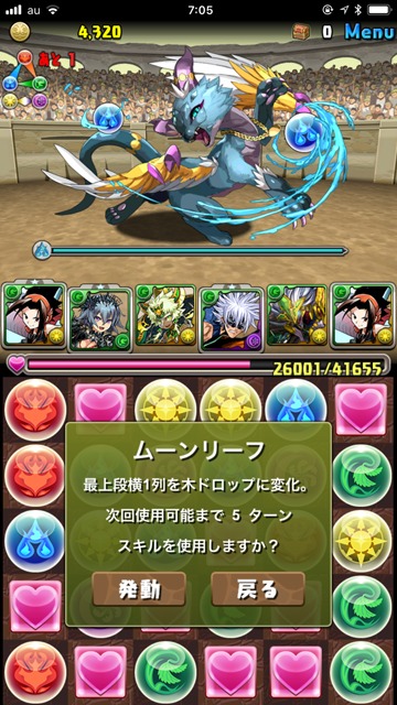 列で供給される木ドロップには触らず、他のドロップ(お邪魔だろうが毒だろうが何でもいい)を5個以上つなげるだけだ。もしも木ドロップが6個以上なくても、他のドロップを5個つなげておくだけでダメージを75%も軽減してくれるので(リーダー×フレンドが麻倉葉の場合)、まあたいがい生き残れる。敵の攻撃をひたすら耐えて、木ドロップが十分溜まったところで、