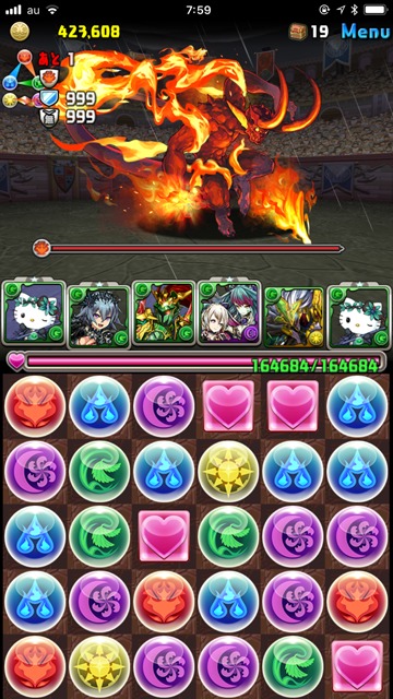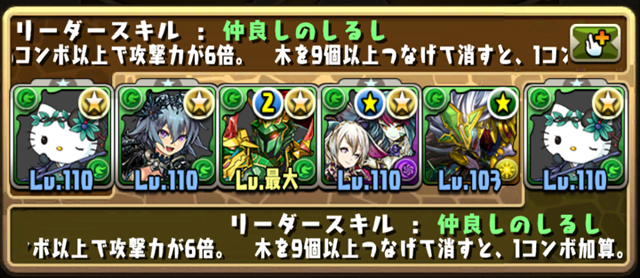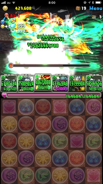 ボーマは“1500万以上ダメージ無効”を使ってくるけど、なんたってこっちには木と回復の2色陣が3枚と、3色陣も1枚あるのだ。さらにリーダーのゼラキティには麻倉葉の武器をアシストで付けているので、それも使えば3ターンのあいだ2コンボ追加という鬼畜の畳み掛けができる。それらを駆使して立ち回った結果……!