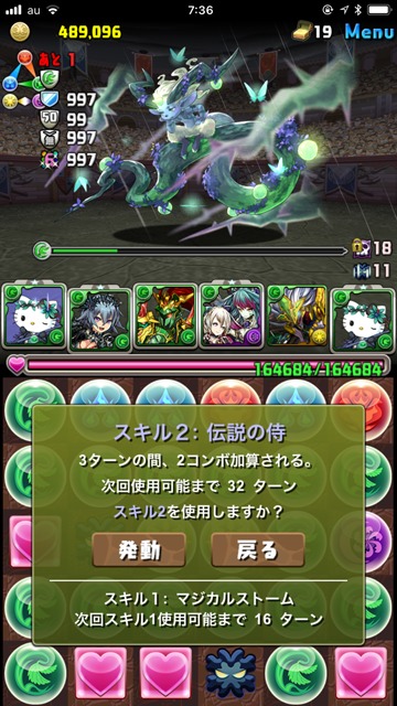 ここで、3ターンのあいだ2コンボ加算という強烈な効果を持つ、麻倉葉武器のスキル(リーダーの第2スキル)をぶっ放す!!