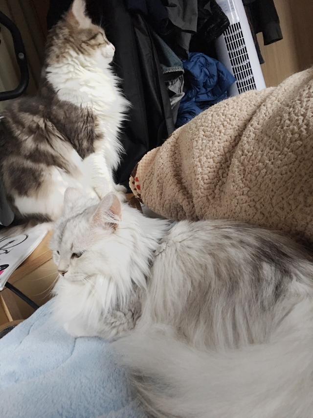 起き抜けのルーチンワークとして、脇で寝ていたニャンコどもに「猫さんたち、おはよ^^」とやさしくあいさつしつつ、