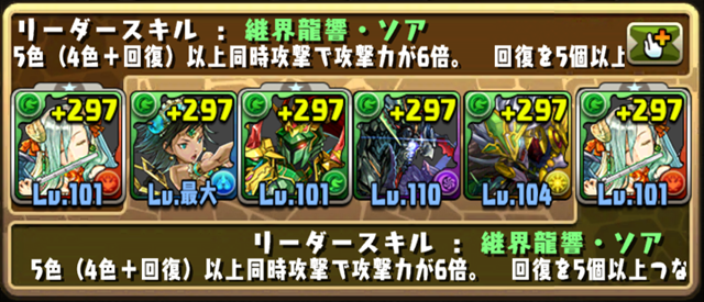 いわゆる多色消しってやつなので、サブのモンスターは基本的に、すべての属性が揃っていれば、主属性と副属性をあーだこーだ言う必要はない。スキルと覚醒スキルを見て、各属性から精鋭をピックアップすればいいわけだ。