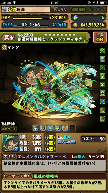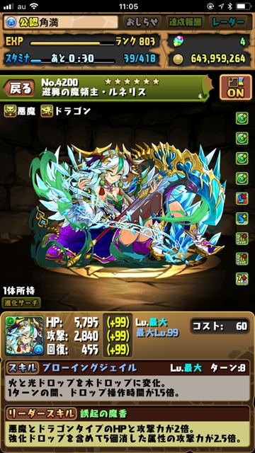 ……が、やっぱりスキルがキツい。8ターンで発動できる軽いスキルであり、その上“1ターンの間、ドロップ操作時間が1.5倍”とじつにありがたい効果がついているのだが……“火と光ドロップを木ドロップに変化”が辛すぎる!!>< いやもちろん、別の木属性リーダーだったらまったく問題ないのだが、エファの下につけるとなると……無理やな……。