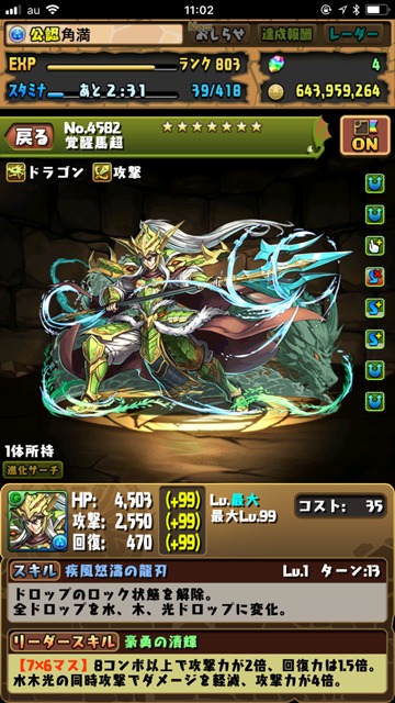 俺の中で“木・水”のモンスターと言えば覚醒馬超であった。覚醒スキルで2体攻撃を4つも持っているので、木の4個消しをすればかなりの高火力が見込める。スキルも、ロック解除に加えて水・木・光の3色陣と、メチャクチャ使えるものである。