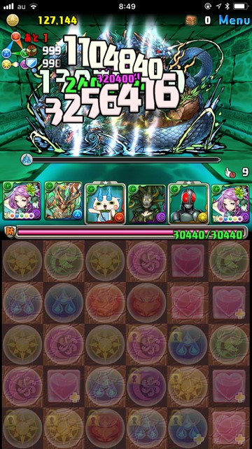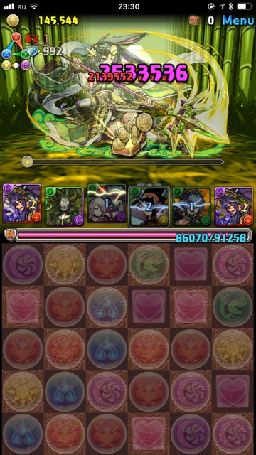 感涙にむせびながら、ダンジョンに突入。木カーリーも、基本的には多色消しのリーダーなので、副属性で色が揃っていれば木属性オンリーでも問題なかった。結果、