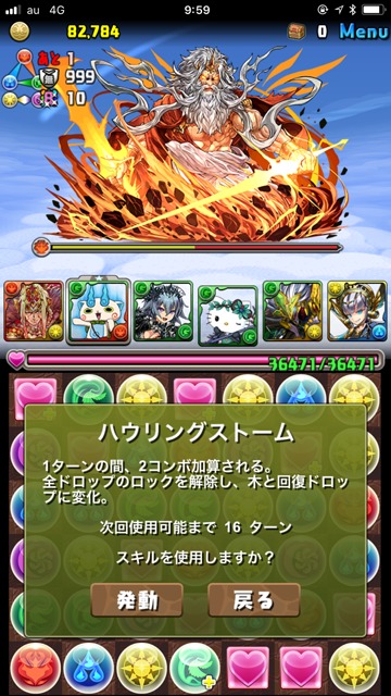 ここで、ゼラのハウリングストームを発動! 盤面を2色にするとともに、1ターンのあいだ2コンボ加算になるので、ゼウス・ヴァルカンの8コンボ吸収も越えられるであろう!