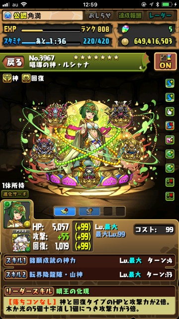 “【落ちコンなし】神と回復タイプのHPと攻撃力が2倍。木か光の5個十字消し1個につき攻撃力が3倍”
