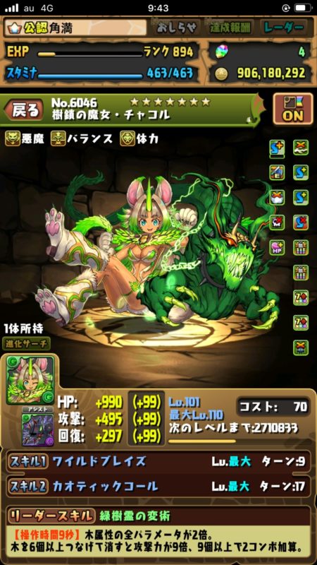 ライザーのところは、出向くダンジョンによってメンバーチェンジするワイルドカード枠。そしてチャコルのリーダースキルに付いていないダメージ軽減は、軽い土蜘蛛の軽減スキルでフォローしてもらおうと計画した。