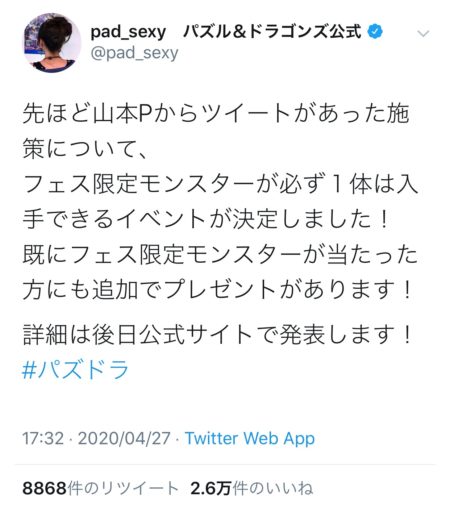 ⇒星6フェス限確定ガチャ1回プレゼント!
