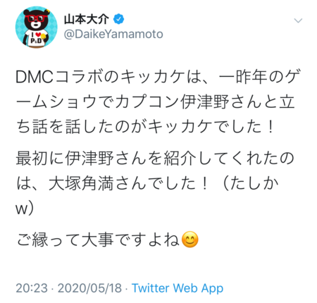 『DMC』とのコラボ開始が告げられたとき、山本プロデューサーが↓こんなことをつぶやいたんだけどさ。