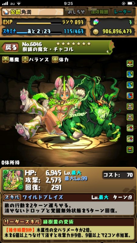 “【操作時間9秒】木属性の全パラメータが2倍。木を6個以上つなげて消すと攻撃力が9倍、9個以上で2コンボ加算”