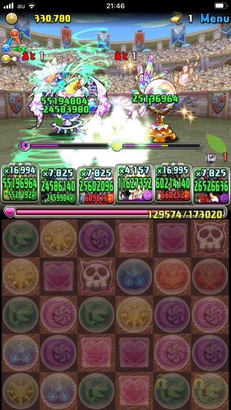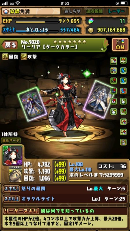 彼女のいいところは、くり返しになるが“木を9個以上つなげて消すと固定1ダメージ”という、追撃込みのリーダースキルであること。また、超覚醒込みでコンボ強化を3個積めるので火力要員としても期待できる。実際に使ってみても、
