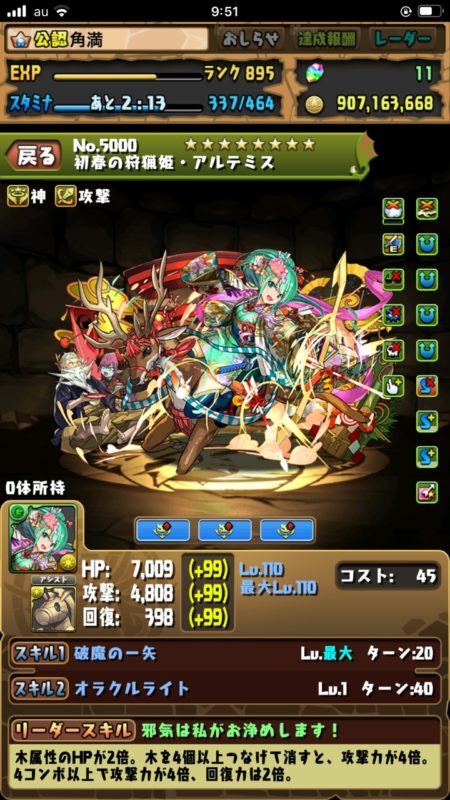 この子のいいところは何と言っても、運用が楽なことだなw 木の4個以上消しと4コンボ以上で16倍の火力が出て、HPも回復も2倍になる。チャコルと掛け合わせれば4倍だ。実際に使ってみても、
