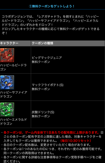 このダンジョンでレアガチャドラを倒すと、稀に、ハッピールビードラゴン、ハッピーサファイアドラゴン、ハッピーエメラルドドラゴンのいずれかがドロップすることがあり、そのキャラに応じた無料クーポンがゲットできるとのこと!!