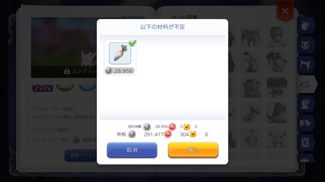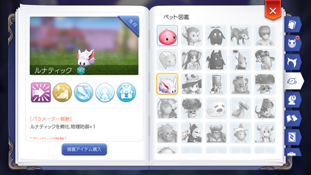 まずやるべきは、“そのモンスターの好物を手に入れる”こと。これは簡単で、“冒険手帳”の“ペット図鑑”を開き、目当てのモンスターを選択したら出てくる“捕獲アイテム購入”のタブをタップすればいい。