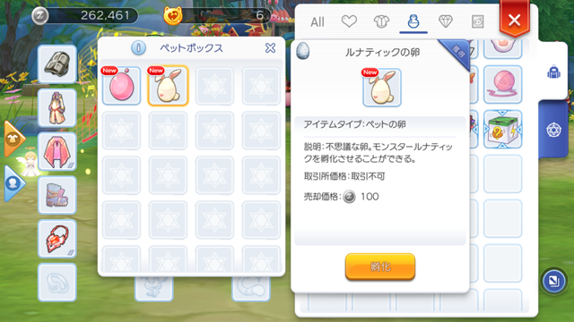 でも、ポリンがペット枠に収まったままなので、ひとまずこちらに休暇を与え、改めてペットボックスの中にある“ルナティックの卵”を孵化!!