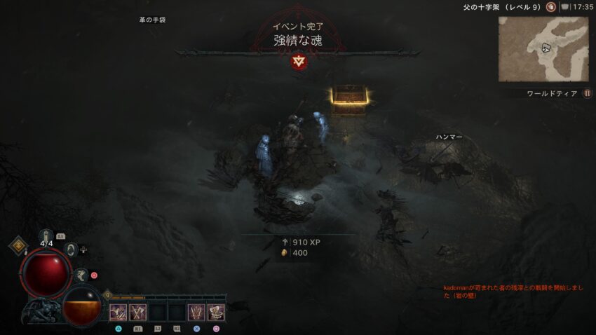 共闘をしていた。前回の記事でも書いたけど、『ディアブロ IV』では知り合いと組んでいっしょに冒険できることはもちろん、こういった行きずりの戦士と会話もないまま同行し、いくつかのイベントをこなしたのちに挨拶もなく別の道に進んでいく……という、“ながら共闘”のシーンがじつに多い。この、後腐れのないユルい関係性は非常に心地よく、オンラインゲームの協力プレイに苦手意識を持っている俺のようなおじさんでも、余裕で“それっぽい”立ち回りができるから素晴らしいのである。