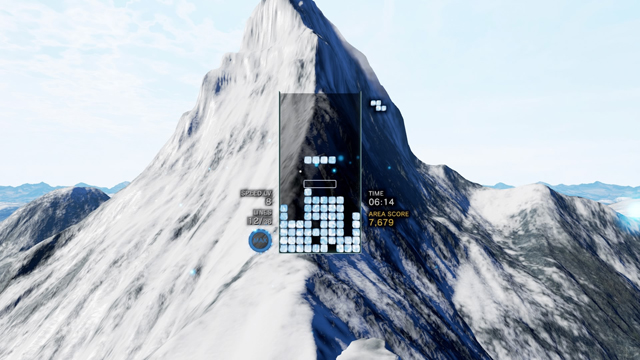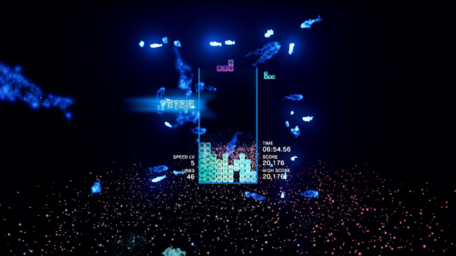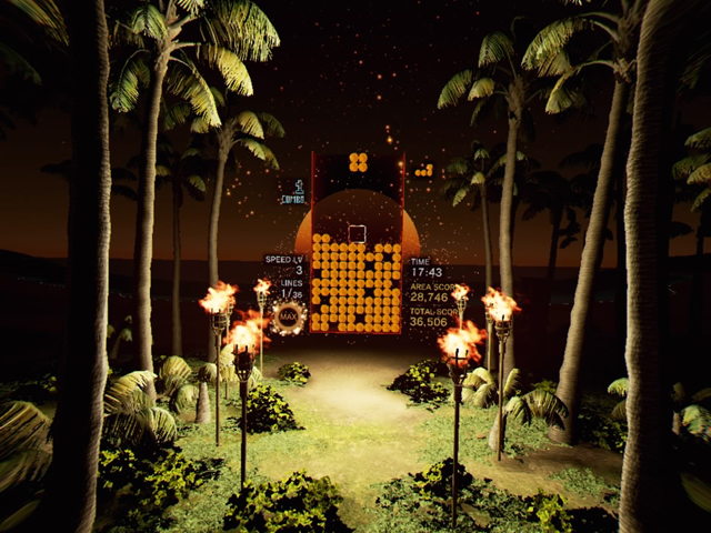 思わず声が漏れる。「きっとこういう映像効果だろうな」とプレイ前に想像はしていたが、実際に音とプレイにシンクロしながら目の前に飛んでくる光の束を見てしまうと、のけ反らずにはいられない。そして当然、『テトリス エフェクト』はステージごとに背景の映像がガラガラと変化し、視覚効果も様変わりするので、先に進むたびに、